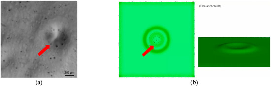 Air can also be trapped during droplet impacting on a wetted substrate. In this case, characteristic rings around the impact center are formed, consisting of several air bubbles, which can be observed both in the simulation (Figure 11b) and experimentally (Figure 11a). In the following simulation results, bubble formation can be observed continuously.