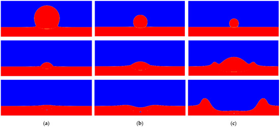 Droplet impact on a wet solid surface (red: liquid, blue: air). Film Hf = 30 µm. (a) D = 30 µm, U = 4 m/s, (b) D = 45 µm, U = 4 m/s, (c) D = 80 µm, U = 8 m/s.
