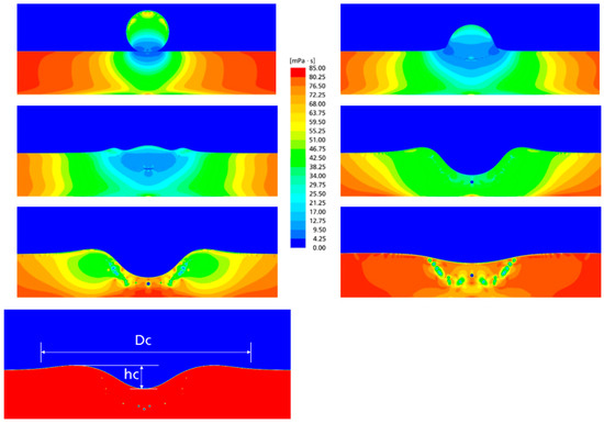 For paint liquids with a shear thinning behavior, the variation in the apparent viscosity during the impact process must be considered. Figure 13 shows the evolution of the viscosity inside the droplet and in the liquid film during the cratering process. In this case, a droplet with a diameter of 65 µm impacts at a 6 m/s velocity on a wet solid surface with a film thickness of 65 µm. The evolution of the viscosity in the whole relevant fluid region from the early stage of droplet impact until the end phase of the impact can be obtained. For a better analysis, the characteristic viscosity of the droplet is determined to be 14.86 mPa·s ( is defined as the viscosity at the characteristic shear rate of droplets in the impact process, ). The corresponding Reynolds number () and the Ohnesorge number () are 24.2 and 0.39, respectively. At the early stage of drop impact, the viscosity is quite low in the collision region due to the very high shear rate in this region (larger than 500,000 s−1). The viscosity in the collision region is approx. 10 mPa·s. Far away from the impact center, the viscosity is about 85 mPa·s, corresponding to the value at the shear rate of zero. At the end phase of the impact, the liquid viscosity is increased to 70–75 mPa·s. In this quasi-static state, a ring-shaped region of low viscosity inside the film under the remaining depression can be observed, where the air bubbles are located.