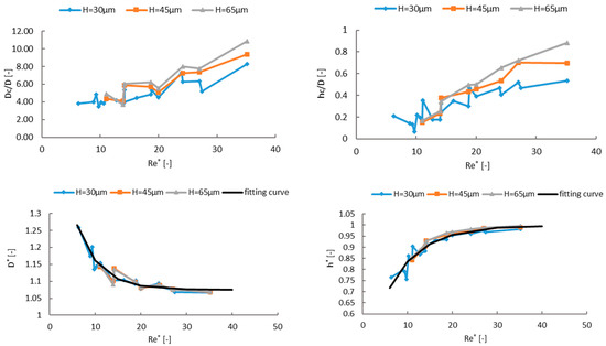 where is the characteristic Reynolds number and is the film thickness. The exponent n indicates the effect of the dimensionless film thickness on the crater size with . In Figure 14, the characteristic crater sizes are plotted as a function of the Reynolds number . A strong correlation between both dimensionless values is observed and can be described using an exponential function: