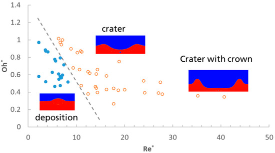 where . Finally, the dependency of the different droplet impact processes on the Reynolds and Ohnesorge numbers is analyzed and depicted in Figure 15, with a blue dot for deposition and a red circle for a crater/crown. In general, the simulation results shown in this section will help to analyze and understand all further investigations, such as the flake orientation during droplet impact on wet solid surfaces, entrainment of air bubbles in the impact process, and the final film leveling.
