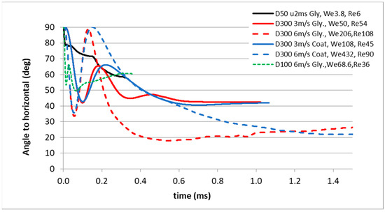 The effects of the droplet liquid properties and the impact parameters on the temporal evolution of the flake orientation are shown in Figure 18. Glycerol/water and paint droplets with η = 20 mPa·s were applied. For small droplets, in the considered case of 50 µm, the quasi-static state is reached at t = 0.3 ms. Since the size ratio between the flake and droplet diameter is relatively large, i.e., l/D = 0.32 for the 50 µm droplet, the movement of the flake is quite limited. In contrast, larger variations in the flake orientation angle can be observed for 300 µm diameter droplets. In addition, the time to reach a quasi-static state significantly increases with increasing We- or Re-numbers. The final flake angle in the quasi-static state depends, presumably, mainly on the Re-number for a given low viscosity. In general, it seems that the final flake orientation improves with an increasing Re-number, at least in the case of droplet impact on dry surfaces.