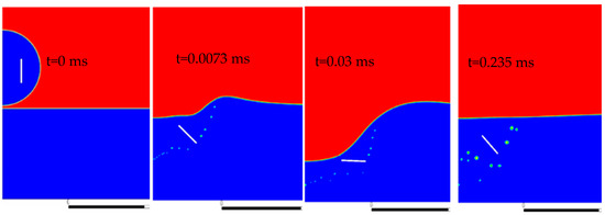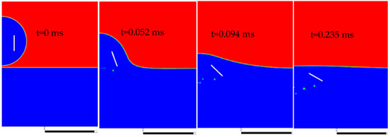 Figure 17 shows the droplet contour evolution and the flake orientation during the droplet impact process. The color bar shows the contact angle. The outer contact angle changes from 120° at the beginning of the spreading process to 60° in the final quasi-static situation. The initial state of the flake is depicted in Figure 17a. During the inertia-driven spreading phase, as shown in Figure 17b,c, the flake is rotating significantly. In Figure 17d, the maximum spreading is reached and surface tension effects become dominant. During this stage, despite droplet contour movements, the above-mentioned contact line hysteresis is observed, which is identical to our experimental findings. Here, the flake is increasing its orientation angle with respect to the surface again. Some changes of flake orientation after t = 0.032 ms (Figure 17d) can be observed (Figure 17e,f,g), until the final location and orientation of the flake at a final quasi-steady state, as shown in Figure 17h. Air entrapment at droplet impact and air bubble formations (blue bubbles) on the wall can also be observed in Figure 17.
