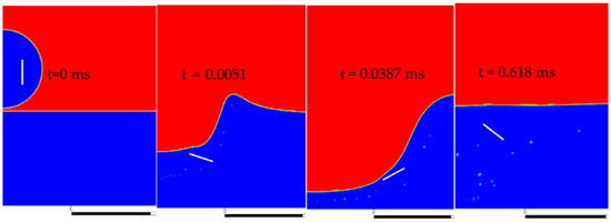 Typical droplet deposition and cratering processes at different impact velocities are shown in Figure 19, Figure 20 and Figure 21, respectively. The wet film thickness is 60 µm. The final flake angle of the droplet deposition in Figure 19 is about 30° with the small impact velocity (U = 0.5 m/s). A typical crater occurs when increasing the impact velocity up to 10 m/s. During the deepening of the crater, as shown in Figure 20, the flake angle decreases and even tends to almost 0 (flake parallel to the surface) at t = 0.03 s. However, during crater retreat, the flake angle increases again significantly and reaches 49.3° in the final quasi-static state. By further increasing the impact velocity to 20 m/s, as shown in Figure 21, the crater size increases heavily, and crown formation can be observed. A larger amount of liquid and the flake are pushed outward from the crater center. The crater retreat begins when the crown disappears. Compared to the case with U = 10 m/s, the process of the crater retreat is much slower due to the thin film at the bottom and the resulting lower surface force. This leads to a lower flake angle (38°) in the final quasi-static state.