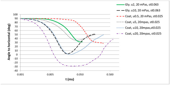 The effect of a surface tension variation on the flake orientation at different impact velocities is shown in Figure 22, using a glycerol/water mixture and paint, both with a constant viscosity of 20 mPa·s. When comparing glycerol/water and paint droplets at a 10 m/s impact velocity, the surface tension shows only a weak effect on the final flake orientation in a quasi-static state, approaching 50° for both cases; however, the time to reach the quasi-static state is significantly extended in the case of the paint droplet with a lower surface tension. At lower impact velocities between 0.2 m/s and 5 m/s, the final flake angles are constantly smaller (around 30°), independent of the surface tension. When further increasing the impact velocity to 20 m/s, the final flake angle seems to decrease. In this case, at t = 0.618 ms the film lever shown in Figure 21 is almost horizontal, corresponding to a quasi-steady state.