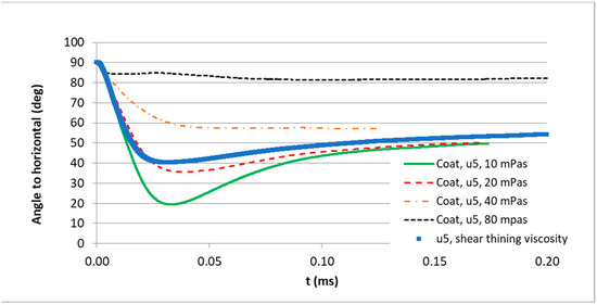 The effect of the viscosity on the flake angle is shown in Figure 23 for a droplet size D of 50 µm, a film thickness H of 60 µm, an impact velocity U of 5 m/s, and a surface tension σ of 0.025 N/m. Clearly, the final flake angle in a quasi-static state increases significantly with an increasing viscosity, especially in case of the 40 mPa·s and the 80 mPa·s liquids. Figure 23 also includes the simulation results of a non-Newtonian, shear-thinning model paint. The corresponding viscosity curve (paint A) is given in Figure 3. For a further explanation of the result, Figure 23 needs to be analyzed, showing the distribution of the apparent fluid viscosity during different stages of droplet impact. As expected, the apparent viscosity diminishes in fluid regions with high shear rates due to the presence of strong velocity gradients. Since the flake is mainly located in a 20 mPa·s fluid zone, especially at a later stage of the impact process (Figure 24c), the flake orientation and the final flake angle correspond nicely to the results of the Newtonian 20 mPa·s case. Although the present investigations focus on a wet file thickness of 60 µm, only a weak effect of the film thickness was found in the range between 30 µm and 60 µm, as shown in Figure 25, which are typical wet film thicknesses of metallic paint layers.