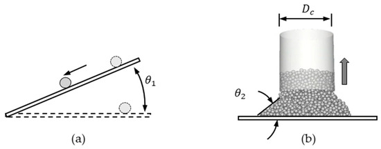 The surface friction coefficient of particles was determined experimentally using an inclined surface setup as depicted in Figure 3a. The slope of the inclined surface was adjusted to initiate particle movement, and the static friction coefficient was measured through the angle of friction (AOF, ), which is the angle at which the particle first begins to move. The friction coefficient between particles was measured using the lifting cylinder method, as illustrated in Figure 3b. This was determined through the AOR (), which represents the stable condition of particles at an optimal angle. The AOR is indicative of the friction between particles and is influenced by their shape and adhesive forces [11,12]. While the diameter of the cylinder () does not affect the AOR, the rising speed does due to the shear effect with the wall. Consequently, the rising speed was set to approximately 10 mm/s, akin to a mixing speed of 15 rpm [13]. Table 3 lists the AOF and AOR values obtained from the experiments. Both and were experimentally determined by measuring the AOF and the AOR, respectively.