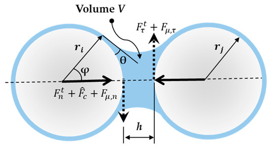 Mikami et al. defined the liquid bridge force as the sum of the contact force and the capillary force, which acts only in the normal direction [20]. This force is quantified using the Laplace–Young equation, presented as Equation (8). Through regression analysis, the capillary force can be modeled in terms of the liquid volume and the separation distance, as shown in Equation (9).