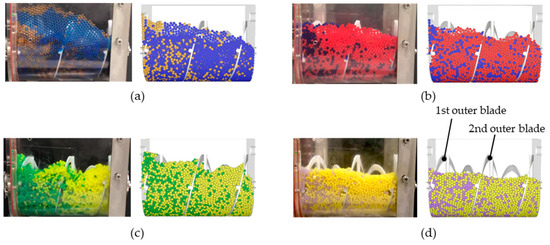 Particle mixing experiments and analysis results at the front of the mixing tub after the fourth revolution: (a) 90% (1.5 mm), (b) 80% (2 mm), (c) 60% (2.5 mm), and (d) dry (4 mm).