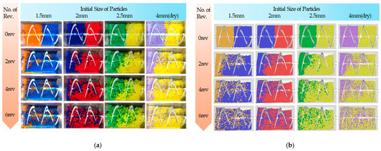 Figure 8 shows a planar observation of particle movement during two rotations of the mixing blade. By comparing the experimental and simulation results, particle traces were investigated based on the particles initially located on the left. After the second rotation (2 rotations), the 90% (1.5 mm) and dry (4 mm) particles completely passed the 90% (1.5 mm) and dry (4 mm) particles began to pass the second outer blade and reach the opposite wall, while the 80% (2 mm) and 60% (2.5 mm) particles passed through the second outer blade in larger amounts. At the 6th rotation (6 rotations), all particles reached the opposite wall. The 90% (1.5 mm) and dry (4 mm) particles showed a well-mixed distribution, but the 80% (2 mm) and 60% (2.5 mm) particles were still distributed on the first outer blade. This pattern of particle movement was consistently observed in both the experiment and simulation results.
