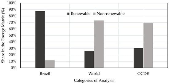 In this context, Brazil stands out due to its energy matrix, which is predominantly based on renewable sources. According to the Energy Research Company [], the Brazilian electricity generation matrix, when compared to the global energy matrix and that of the member countries of the Organization for Economic Cooperation and Development (OCDE), presents a scenario with less environmental impact, with only 12.1% of national energy coming from non-renewable energy. On the other hand, the International Energy Agency (IEA) [] highlights that both the global energy matrix and that of OECD countries have lower shares of renewable sources (Figure 1).