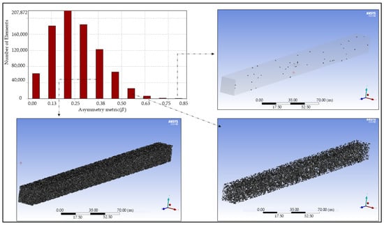 The statistical analysis by means of the parameter is employed utilizing the ANSYS software, allowing a detailed assessment of data distribution and the quality of the mesh generated during the simulation. As shown in Figure 5, the generated mesh presents the maximum and minimum values of equal to 0.836100 and 0.000149, respectively.