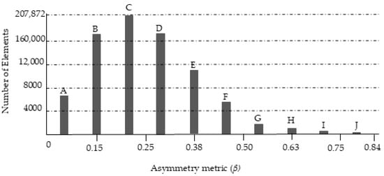 Distribution of mesh elements in categories A, B, C, D, E, F, G, H, I, and J, according to values.