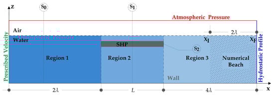 The divisions of the NWT are established based on the study by Seibt et al. [] and are illustrated in Figure 8. The channel is segmented into three regions: Region 1 consists of the wave propagation zone and has a length of 2λ, equivalent to 120.8 m and 140.8 m; Region 2, with a length L, varies depending on the SHP geometry; and Region 3 has a length of 4λ, corresponding to 241.6 m and 281.6 m, respectively. This region contains the numerical beach, starting at the initial position and extending to the end of the channel (hydrostatic profile), with a length of 120.8 m and 140.8 m, which corresponds to 2λ.