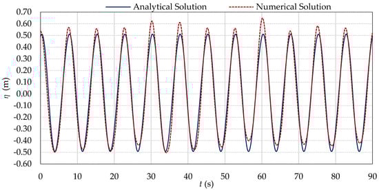 This reduction in error could be attributed to the stabilization process of the numerical model, which was configured with the use of a numerical beach for wave energy dissipation. During the initial moments of the simulation, the system might have been adjusting to its initial conditions, resulting in larger discrepancies. As the simulation progressed, the model configuration stabilized, leading to a greater agreement between the numerical results and the analytical solution. Although the phenomenon of reflection at the numerical beach was an important factor, the observed reduction in error was more related to the stabilization of the simulated process than to the complete absorption of waves by the numerical beach.
