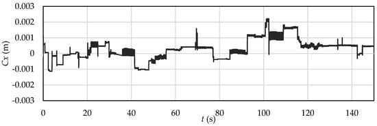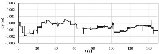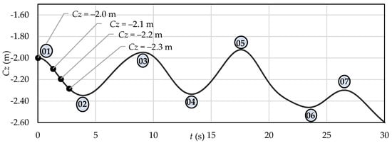 Representation of the displacement Cz of the SHP due to the wave action and movement restrictions, in relation to the y- and x-axes, represented by cables 1, 2, 3, 4, 5, 6, 7, and 8.