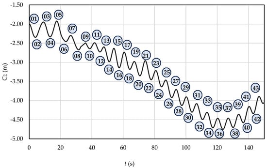 In this sense, in the code, the inertia moments are defined as zero, so the mass distribution of the system does not make it susceptible to rotation around its principal axes when subjected to external forces. Displacement constraints are applied to the SHP, allowing translational movement only along the z-axis, while rotational movements around the x-, y-, and z-axes are restricted. This configuration simulates anchoring by cables 1 to 8, resulting in significant displacements only along the z-axis direction (Cz), as illustrated in Figure 4.