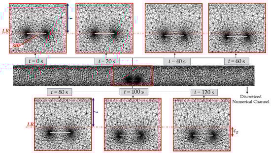 The velocity components in the y-axis direction (transversal) are kept constant, with no variation along the x- and z-axes, indicating that the flow is essentially two-dimensional, focusing only on the x–z plane []. According to second-order Stokes theory, the movement in the y-axis direction (transversal) is considered negligible [], implying the following:
