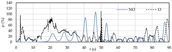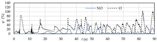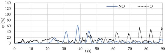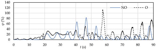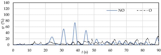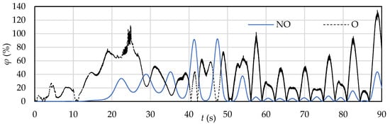 On the other hand, the NO condition exhibited a higher value of = 6.83%, compared to the O condition. This could be attributed to the configuration which resulted in a higher value of = 147,343.50 W in the NO condition relative to = 123,825.84 W observed in the O condition. This result suggests that the NO condition generated a more efficient interaction between the wave and the structure, leading to a higher energy transfer. This behavior was observed only in this case, among the seven simulated cases (Table 6).
