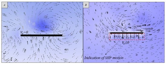 Velocity vectors in the vertical direction () of the SHP, Case 1, under NO condition (A) and O condition (B) at t = 90s.