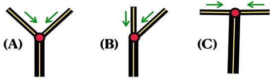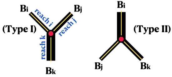 Consider three type-I junctions, as depicted in Figure 4. The configuration of the Y-shaped domain, whether it is symmetric or not, should play a role in the flow distribution along the reaches. Also, this should be applicable for wave reflection, as opposed to a pure streaming flow. As an extreme, consider case (A), which is depicted in Figure 4, and case (C). The incoming reaches (both i and j) have half the width of the outgoing reach k. Imagine case (A) with a very small angle upstream (between reaches i and j). For this case, we should not expect back-flow (wave reflection), as opposed to a T-shaped configuration, where there should be a nontrivial flow upstream. Consider expression (26) with the incoming vector given by . Namely, the flow arriving from reaches i and j is the same (at all times), while there is no upstream flow arriving from reach k. For the case (say, with and , for simplicity) it is straightforward to show that the outgoing vector given by (26) is .