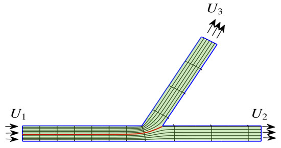 For the fattened (2D) graph-like domain, impose the very simple regime of a steady flow , with no wave elevation, so that . For this regime, system (27)–(29) reduces to the incompressibility condition . Adding the hypothesis of an irrotational flow, , allows for the existence of a velocity potential , such that . Incompressibility implies that the velocity potential is a harmonic function, which has the stream function as its harmonic conjugate, where . Using a complex potential , with , leads to a complex velocity which automatically satisfies the constraints for an incompressible, irrotational flow, due to the Cauchy–Riemann equations for and . Milne-Thomson [13] then uses a sequence of conformal-mapping compositions to express the solution for the streaming flow in an asymmetric junction with angle , as shown in Figure 5. Very quickly, at a small distance away from the branching region, the flow aligns uniformly, parallel to the side walls which have no lateral variations. Milne-Thomson [13] provides the following equation that relates the three limiting uniform speeds along each reach: