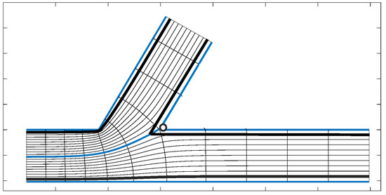 In order to deal with the conformal mapping’s singularity, we consider a slightly wider forked channel to be mapped by onto a uniform strip in the canonical w-plane, as shown in Figure 7. The Jacobian of this mapping blows up at the corner highlighted with a circle. To avoid the singularity, the physical domain is defined by the slightly smaller region within the region bounded by the thicker inner curves. The mapping’s separatrix is depicted emanating from the singular point. For the numerical simulations, the values of the Jacobian are finite and taken from this inner region, which has the singularity nearby, but outside the domain of interest. This is depicted in Figure 9.