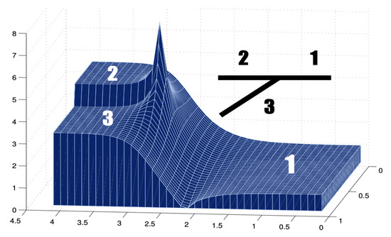Using the Schwarz–Christoffel Toolbox [17] we evaluate and plot the Jacobian of an asymmetric forked region, as shown in Figure 9. Note that the singularity is felt near the branching region, shown by a spike. But the spike is finite, since the singularity is outside the domain. Away from the forked region, the Jacobian very quickly reaches plateaus of constant value. This is related to the discussion presented together with Figure 5. The roles played by the coordinates and , as functions of the inverse mapping , are analogous to the roles played by and in the steady streaming flow presented by Milne-Thomson [13]. Note that in Figure 5, a short distance away from the forked region, the streamlines (aligned with the walls), together with potential level-curves, form a Cartesian grid. This means that the Jacobian matrix away from the forked region is a constant multiple of the identity. Namely, it is a rotation and/or rescaling of the standard Cartesian coordinates.