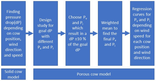 Here, dPj is the resulting pressure drop of the jth design case in Pa, dP is the target value for the particular combination of cow position, wind speed, and flow direction in Pa, and Pi,j and Pv,j are the resistance coefficients used for each jth design case. These values were then combined in a regression curve for each cow position and wind direction so that the resistance coefficients are a function of wind speed. Figure 2 gives an overview of this procedure.