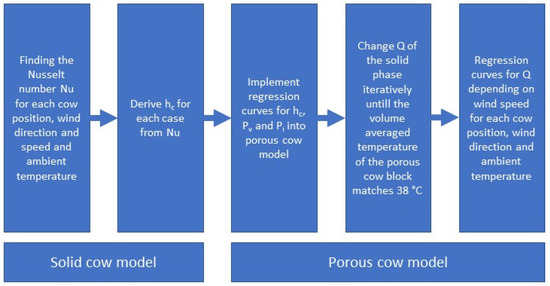 The already known parameters (Pi, Pv, and hc) were implemented in the porous cow model. Iteratively, the heat flux coming from the porous block was changed for each case until the volume-averaged parameter, “temperature of cow”, matched 38 °C. This was carried out again for the two different ambient temperatures T0 = 0 °C and T0 = 20 °C. The procedure is summarized in Figure 4.