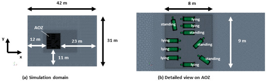 Dimensions and surface mesh of the simulation domain for the comparison of the solid and porous cow models in a small AOZ: (a) view of the whole simulation domain; (b) detailed view of the AOZ.