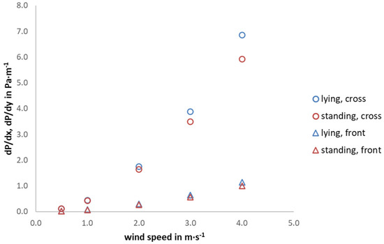 Figure 8 shows the results for the pressure drop per length in Pa·m−1 of the single solid cow model as a function of the cow position, flow direction, and wind speed.