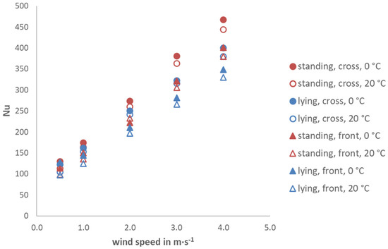 The results for the Nusselt number of the solid cow model as a function of cow posture, wind speed, and flow direction are shown in Figure 10 for the two ambient temperatures of T0 = 0 °C and T0 = 20 °C, respectively.