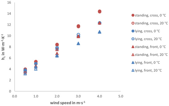 These parameters show a linear increase with increasing flow velocity. The values vary between 3.18 W·m−2·K−1 for the lying cow facing a front flow of 0.5 m·s−1 at 20 °C and 14.42 W·m−2·K−1 for a standing cow in a cross flow of 4.0 m·s−1 at the same temperature. These values are in the range of those reported by [2] for a whole AOZ. The influence of the change in ambient temperature can hardly be seen in the resulting heat transfer coefficient values. For this reason, only the variations in cow position and direction of flow are taken into account for the regression formulae. This leads to the equations for the heat transfer coefficient, hc, listed in Table 2. These results represent the mean value of the linear trends for a combination of cow position and flow direction for the respective temperatures from Figure 11. The high R2 values confirm the linear progression already seen in Figure 11.