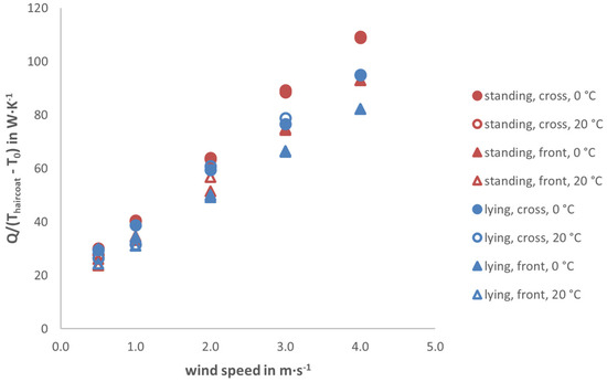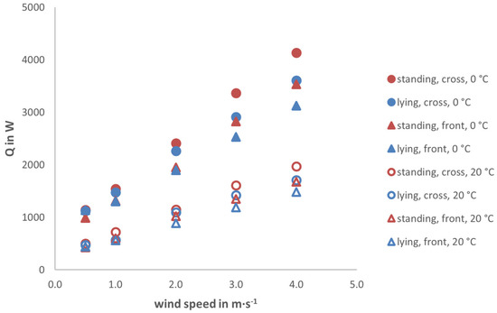 The linear progression of the Nusselt number of the solid cow model (see Figure 10) can also be seen here. The heat flux at the lower ambient temperature is higher than at the higher ambient temperature. The range is from 428 W (standing, front, 20 °C, 0.5 m·s−1) up to 4134 W (standing, cross, 0 °C, 4.0 m·s−1).