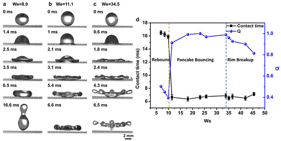 The influence of We on the bouncing behaviors on v-SCA. Selected snapshots captured by a high-speed camera showing the process of a water droplet (V = 17.9 μL) impacting on v-SCA (s = 300 μm, H = 600 μm) at different We. (a), At a low We = 8.9, the droplet shows conventional bouncing. (b), At the critical We =11.1, droplet pancake bouncing can be formed. (c), At a high We = 34.5, the droplet shows rim breakup. (d), The relationship between the contact time and Q versus We for a water droplet (17.9 μL). At We in the range of 10–45, the Q is larger than 0.8, and the contact time ranges from 6 to 7 ms. Pancake bouncing is generated in the following region: We range of ~12–33, Q range of 0.9–1.0, and there is the lowest contact time of 6.6 ms.