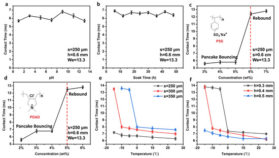 As the practical application environment is usually complex and the surface properties may change under these conditions, the study of bouncing behavior under specific conditions is essential. The bouncing behavior was tested with droplets with different pH values, after different soaking times in sea water, droplets with polyelectrolytes of positive and negative charge, and under different temperatures. Due to environmental pollution, water droplets in nature are generally not neutral. The v-SCA (s = 250 μm, H = 600 μm) was used to study the influence of pH at We = 13.3. Figure 5a shows the variations in the contact time with droplets with different pH values (see Figure S6 and Supplementary Video S4). The contact time remains at ~6 ms in the entire range of pH (0–14), indicating that pancake bouncing occurs for the entire range of pH. The v-SCA remains stable under acid and alkali conditions. The v-SCA also remains stable to brine. Figure 5b shows the variations in the contact time with soaking time in sea water (see Figure S7). Pancake bouncing still occurs even when soaked in sea water for 50 h. The contact time remains at ~6.5 ms. Recently, Jin et al. discovered that polyelectrolytes had a strong influence on ice propagation [30]. Given this phenomenon, we employed poly (sodium 4-styrenesulfonate) (PSS, negative charge) and poly (diallyldimethylammonium chloride) (PDAD, positive charge) to study the influence of polyelectrolytes on the bouncing behavior. Figure 5c shows the variation in the contact time with the concentration of PSS in water droplets (see Figure S8 and Supplementary Video S5). The contact time remains at ~5.8 ms for a PSS concentration from 3 to 5%, and a sudden large increase occurs at the concentration of 6% with the contact time increasing to 12.3 ms. The contact time increases to 12.6 ms when the concentration increases to 7%. The critical PSS concentration for pancake bouncing is 6%. Figure 5d shows the variation in the contact time with the PDAD concentration (see Figure S9 and Supplementary Video S6). The contact time increases slightly from 5.6 ms to 6.8 ms as the PDAD concentration increases from 2% to 3% and 4%, and a sudden large change occurs at the concentration of 5% with the contact time increasing to 12.3 ms. The critical PDAD concentration for pancake bouncing is 5%. One of the major applications of pancake bouncing is in the field of anti-icing; however, most of the previous work was conducted under normal temperature. We studied the influence of temperature on the bouncing behavior. The bouncing experiments at various temperatures were conducted by placing v-SCAs on a cold stage with a temperature controller (see Figure S10 and Supplementary Video S7). As shown in Figure 5e, for the v-SCA with s = 250 μm and H = 600 μm, at We = 13.3, pancake bouncing occurs from 25 °C to −15 °C, with the contact time increasing from 6.5 ms to 7.2 ms (s = 250 μm). For the v-SCA with s = 300 μm and H = 600 μm, at We = 13.3, pancake bouncing occurs from 25 °C to −10 °C, with the contact time increasing from 7.0 ms to 8.0 ms. Conventional rebound occurs when the temperature decreases to −15 °C. For the v-SCA with s = 350 um, pancake bouncing occurs from 25 °C to 0 °C, with the contact time increasing from 7.6 ms to 8.0 ms. Conventional rebound occurs at −5 °C and −10 °C. The droplet pinned on the SCA when the temperature decreases to −15 °C. As shown in Figure 5f, for the v-SCA with H = 500 μm (s = 250 μm) at We = 13.3, pancake bouncing occurs from 25 °C to −15 °C, with the contact time increasing from 6.5 ms to 7.1 ms. For the v-SCA with H = 400 μm (s = 250 μm) at We = 13.3, pancake bouncing occurs from 25 °C to −10 °C, with the contact time increasing from 7.1 ms to 8.0 ms. Conventional rebound occurs when the temperature decreases to −15 °C. For the v-SCA with H = 300 μm, pancake bouncing occurs from 25 °C to 0 °C, with the contact time increasing from 7.3 ms to 7.7 ms. Conventional rebound occurs from −5 °C to −15 °C.