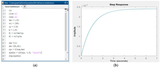 As shown in Figure 3, we obtained the discrete-time response, in which the programming code in MATLAB R2015, which is related to the application of the Tustin method, is presented. The programming considers the density of the ambient air, mass flow, specific heat, and the volume of the centrifugal sugar dryer, and it also presents the behaviour of the discretized function of the plant acting as the digital twin with a sampling period of 0.05.