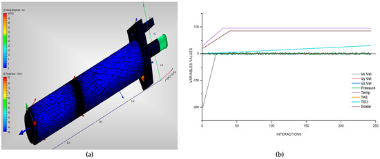 In the CFD software, the mesh was established for the calculation of the interactions to be integrated in the geometrical figure. The mesh has 1,175,386 nodes and 4,775,685 elements for the simulation. As shown in the graph of Figure 7b, the dynamic system shows a stable behaviour, with the temperature constant at 97 °C and a velocity of 48 m/s on the X-axis. The pressure shows small fluctuations that are considered negligible.