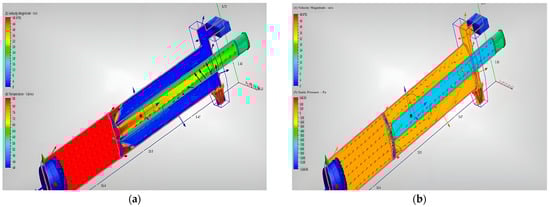 Figure 9 shows the fluidisation simulation of the interacting variables in the operation of the rotary dryer. Figure 8a (left) shows the thermal distribution of the fluidised and vectorial behaviour in the different compartments of the rotary dryer, resulting in a turbulent flow in the hot and cold air mixing zone. The uniform temperature of 85 °C is presented on the right side of Figure 8b, where the humidity is extracted from the sugar and the air flow is extracted by the fan, and it behaves in a laminar form. In this proposal, the ambient air maintains the sugar temperature between 30 and 35 °C, which is ideal for continuing the packaging process without compressing and melting the raw material.