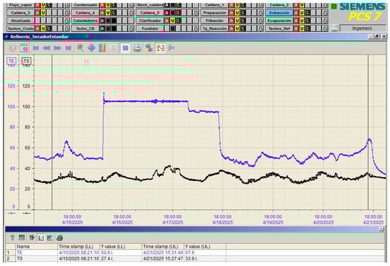 To validate the developed CFD model, real-time experimental data obtained from the Siemens PCS 7 distributed control system (DCS), corresponding to a centrifugal sugar dryer operating with hot air, were used. The variables considered were the inlet air temperature (TE) and the outlet temperature (TS) during continuous operation between 15 and 21 April 2025, as shown in Figure 11.