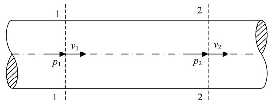 For gases, the effect of changes in the positional potential energy is negligible; hence, the terms, and , can be omitted from Equation (1). For the horizontal straight pipe depicted in Figure 1, the local head loss, , is not considered. According to Darcy’s equation, the frictional head loss, , can be expressed as follows:
