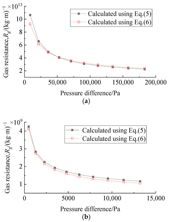 Simulated gas resistance values calculated using the definition and determination equations. (a) Inner diameter 1 mm, length 1000 mm; (b) inner diameter 6 mm, length 1000 mm.