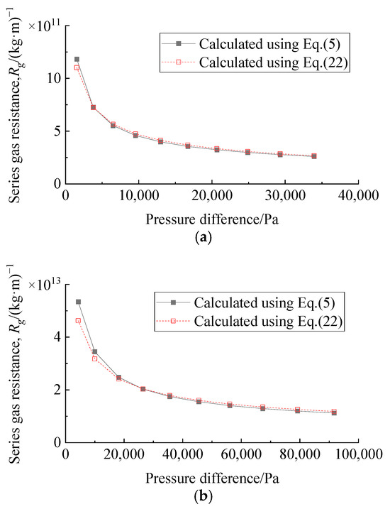 The gas resistance values were calculated using both the definition Formula (5) and the determination Formula (22). The gas resistance value–pressure difference relationship curves were plotted based on the calculation results, as shown in Figure 6. The results indicate that the gas resistance value of the series pipeline decreases as the pressure difference at its ends increases. Overall, the gas resistance values calculated using the definition Formula (5) were consistent with those calculated using the determination Formula (22), with discrepancies appearing only at small pressure differences.
