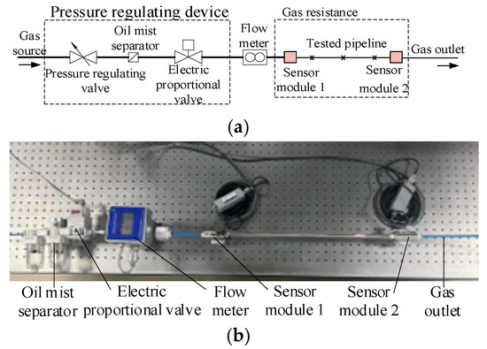 The experimental setups shown in Figure 7 and Figure 8 were designed for the gas resistance experiment and the series gas resistance experiment, respectively. The pipeline to be measured and the sensor installation module were connected via threaded joints. The sensor installation module was flexibly connected to the electrical proportional valve and flow metre using quick connectors, and the measuring device was placed on a vibration isolation platform.