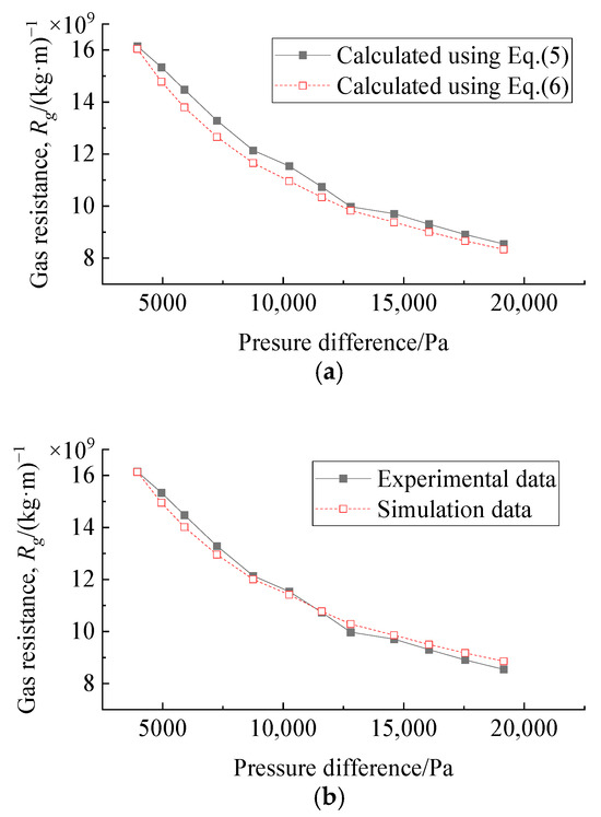An analogue simulation model of the experimental device was constructed in COMSOL, and the simulated gas resistance values were calculated using Equation (6). The relationship curve between the gas resistance value and the pressure difference is shown in Figure 9b.