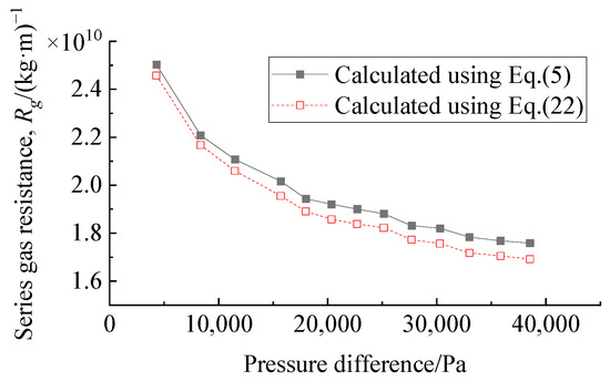 From Table 2, it can be seen that because the last three terms depend on the structural parameters of the pipeline and are unaffected by the flow state, their influence on the series gas resistance value increases with the pressure difference across the series pipeline. For example, in Case 1, when the pressure difference is 1.5 kPa, the last three terms account for only 3% of the series gas resistance. However, when the pressure difference increases to 34 kPa, the contribution of these terms rises to 13%.