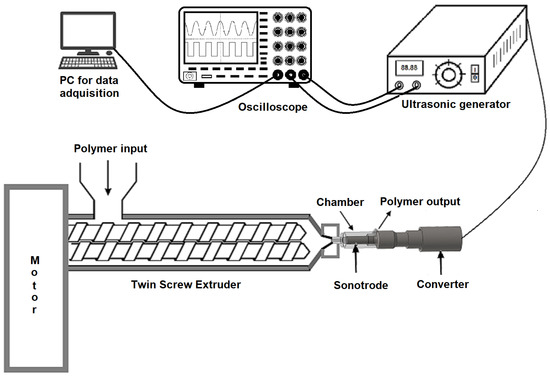Based on these principles, ultrasonic irradiation has been used for the synthesis of nanoparticles, like hydroxyapatite, graphene, and carbon nanomaterials [5,6,7]. Ultrasound-assisted methods have been used in in-situ emulsion polymerization for polymer nanocomposites, helping in the preparation of stable and finely dispersed polymer nanocomposites and developments in the preparation of core-shell particles [8,9], in addition to ultrasound-assisted adsorption of dyes on nanoparticles and composites [10] and water remediation [11,12]. Ultrasonic waves have also been employed as a nondestructive technique for assessing agricultural product quality, among other applications [13]. In engineering applications, ultrasonic waves have been used during the processing of molten polymers, a technique known as ultrasound-assisted melt extrusion (USME). The USME process has been employed to enhance polymer compatibility [14], improve the dispersion of nanoparticles in polymers [15,16], and promote the production of branched polymers [17]. However, the interaction mechanism between polymer chains and ultrasonic waves remains largely unexplored. In the USME process, an extruder, an adapter, a horn, and an ultrasonic generator are required. When the generator is connected to the power source, it converts low-frequency electrical energy into high-frequency energy. This energy is then transformed into mechanical vibrations through a piezoelectric transducer, which amplifies the signal and transfers the vibrational energy to the medium or material [18].