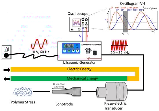 The electrical system operates by converting conventional low-frequency electrical energy (60 Hz) into ultrasonic energy (10–100 kHz) using an ultrasonic generator. This high-frequency energy is subsequently transferred to the piezoelectric transducer. Through the expansion and contraction of metallic electrodes connected to the piezoelectric elements, the transducer generates longitudinal mechanical vibrations that are ultimately transmitted directly to the polymer as a shock wave front. These generated vibrations exhibit a periodic oscillatory behavior governed by the applied voltages and currents, which are determined by the frequency and power supplied by the generator.