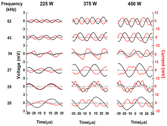 In this study, “harmonics” are defined as those frequencies that exhibit a stable waveform and can be consistently replicated in a digital oscilloscope. These harmonics were identified based on minimal noise and interference in the voltage and current signals, as well as their attenuation or magnification. The observed alterations in electrical behavior originate from the mechanical stress applied by the molten polymer on the horn tip, leveraging the well-known property known as the piezoelectric effect [17,18]. In this scenario, the polymer acts as a resistive element, generating electric charges in response to the applied pressure. Consequently, variations in polymer viscosity induced by ultrasonic wave exposure result in corresponding modifications in both current and voltage. As a result, a characteristic waveform pattern is observed for each voltage–current pair at each of the detected harmonics [20,24]. It is essential to clarify that while the horn is designed to resonate at a primary frequency of 20 kHz, this is determined when it is not immersed in a fluid. However, when the horn is in contact with a fluid, the resonance frequencies are modified due to changes in the density or viscosity of the medium, reducing the probability of cavitation [1].